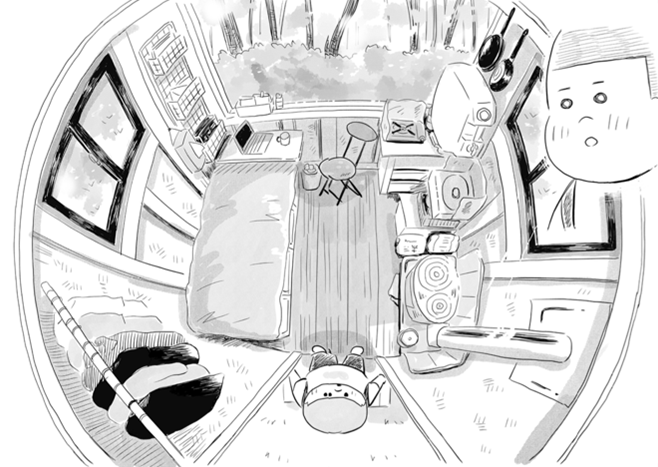 ある日、道生が訪ねたのは、建築面積はわずか2畳という小さな山小屋。家主の手作りなのだという。中に入ってみると、大きい窓があるから開放感があり、ふんだんに使われた木々や、細部の造りが美しい。