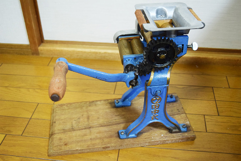 試すにあたり、最近購入した家庭用の製麺機で自家製の麺を作り、スープも自前で用意してラーメンを作ることにした。ハンドル式の小型製麺機は昭和中期頃に一般家庭に普及した古いもので、オークションサイトなどで中古品が安く売られているのだが、思い切って買ってみるとこれがなかなか楽しいのだ。