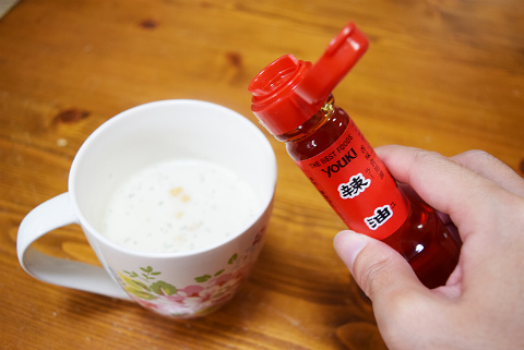 次に、「ラー油+ポタージュスープ」を試してみる。これもまた、頭の中になかった組み合わせで驚いた。