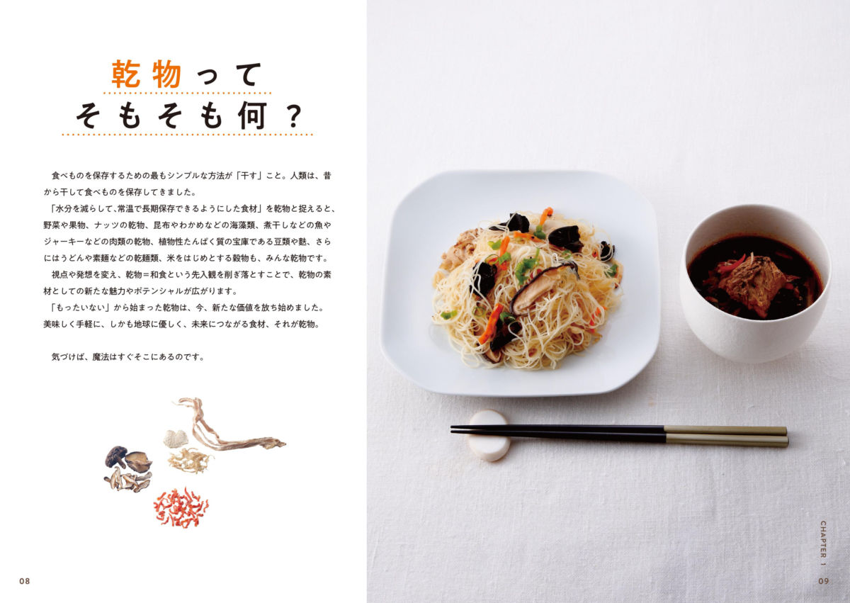 本書の中で使われる乾物は11種類。多くの種類の乾物の中から、味わい、彩り、食感、料理のしやすさや使い勝手、組み合わせの多様さを考えて、海のものと山のものからバランスよく選ばれています。オリジナルレシピ42品を掲載し、乾物の魅力を余すところなく紹介している1冊です。