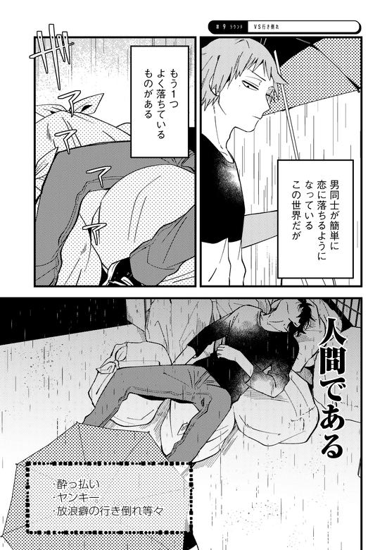 とにかく、どうにも避けられないようなフラグが主人公を次々と襲ってくるのだ。このような状況に遭遇した場合、普通であれば声をかけたり、警察に通報したりするだろう。しかし、この世界では「自宅に連れて帰ること」が当然だという。いやいや、と苦笑しそうになるが、記憶を辿ると「当然のように自宅に連れ帰るBL作品めちゃくちゃ読んでるわ…」となる。いかに自分が普段「ありえない世界観」に入り浸っているのか気づく。