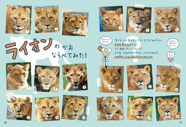 ページいっぱいに並べられた同じ種類の動物の顔。そのなかに、似ているけど違う、別の種類の動物が混ざっています。比べて楽しむ遊びを通して、動物の生態や種類の見分け方が理解できるようになる、新しいスタイルの写真絵本です。