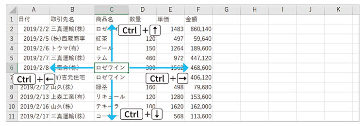 キーボードの矢印キーを使えば、セルの上下左右へのジャンプや複数セルの選択など、さまざまな動作をマウスを使わずに行えます。