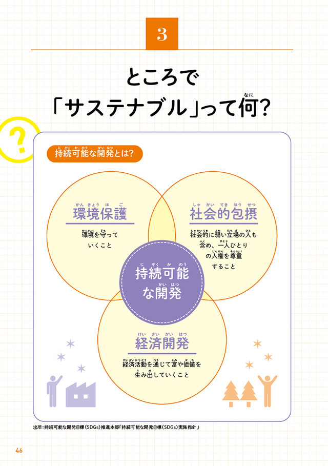 今、世界はSDGsを達成することで「サステナブルな開発」、つまり「持続可能な開発」を目指しています。左ページのように、「持続可能な開発」は、「環境保護」「社会的包摂」「経済開発」の3要素の調和が求められています。簡単にいえば、環境を守り、すべての人の人権を尊重しながら経済成長をしていくことです。逆にいえば、3要素のいずれかが欠ければ、持続可能とはいえません。