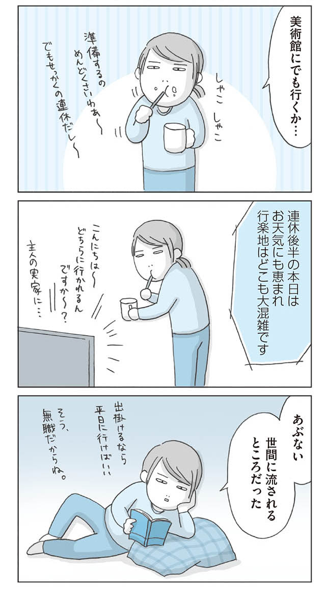 ポイントカードを作るとき、登録用紙に無職だけど「会社員」と記載する/思いつき無職生活 マンガ 公開日:2022/1/17 思いつき無職生活 職なしガールの残念だけど悪くない日々 (コミックエッセイ) この連載を最初から読む→ 『思いつき無職生活 職なしガールの残念だけど悪くない日々』を楽天Kobo(電子)で読む > 『思いつき無職生活 職なしガールの残念だけど悪くない日々』をRenta!で読む > >> 結婚式の招待状 « 1 2 3 > 『あの頃世界のすべてだった学校と自分への呪いにさよならするまで』を最初から読む! 前の回 一覧 人気の連載 次の回 思いつき無職生活 職なしガールの残念だけど悪くない日々 (コミックエッセイ)