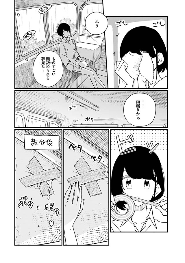 大雨の日、雨漏りする廃バスを修理した雨森先生。ふと、廃バスを見つけた日のことを思い出す/廃バスに住む②
