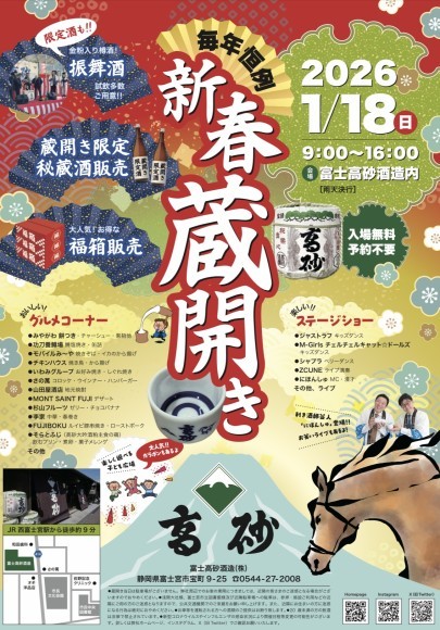 新春恒例「富士高砂 新春蔵開き」開催!富士高砂酒造では、新年の幕開けを祝う恒例イベント**「新春蔵開き」**を開催いたします。蔵人の想いが詰まった日本酒と、地域の魅力を一度…