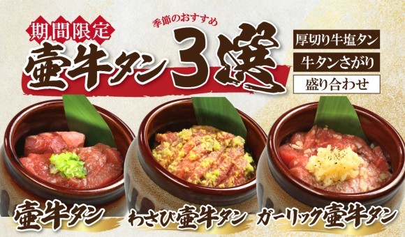期間限定「壷牛タン3選」厚切り牛塩タン、牛タンさがりを贅沢に使用した牛タン好きにはたまらないラインナップです。■ 壷牛タン/950円(税込1,045円)噛むほどに広がる牛タンの旨味…