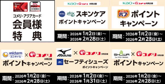 ■1月スタートの新規キャンペーンKao×コメリ共同企画 ニベア アトリックススキンケアポイントゲットキャンペーン期間中、対象商品を同日同店舗でお買い上げ、税込1,500円以上を1口…