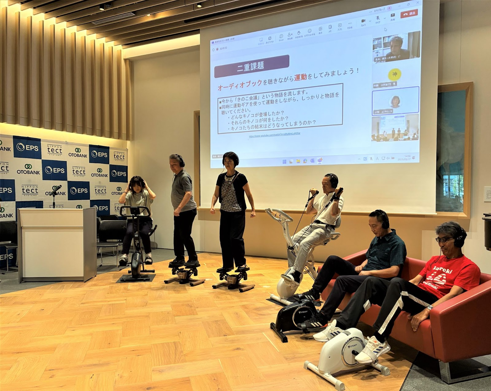 さらに、協賛企業であるステディジャパン株式会社の運動機器を用いたデモンストレーションが実施され、参加者はヘッドフォンでオーディオブックを聴きながら実際に運動しました。その際、重森教授からは「運動強度は“やや強めぐらいが良い”」とのコメントが寄せられ、効果的な実践方法に関する具体的なアドバイスも示されました。