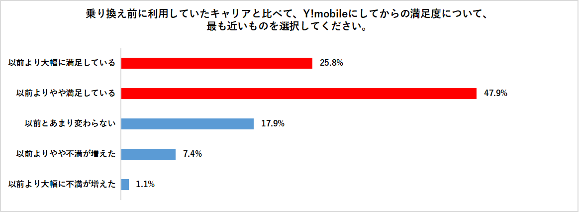 乗り換え前後の満足度比較では、「以前より大幅に満足している」(25.8%)と「以前よりやや満足している」(47.9%)を合わせ、全体の73.7%が改善を実感。
