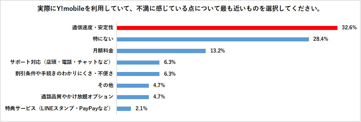 不満点では「通信速度・安定性」(32.6%)が最多でしたが、「特にない」(28.4%)が僅差で続き、全体では約3人に1人が不満なしと回答。