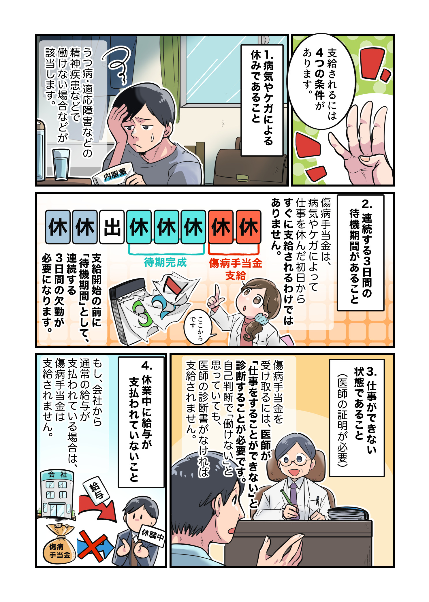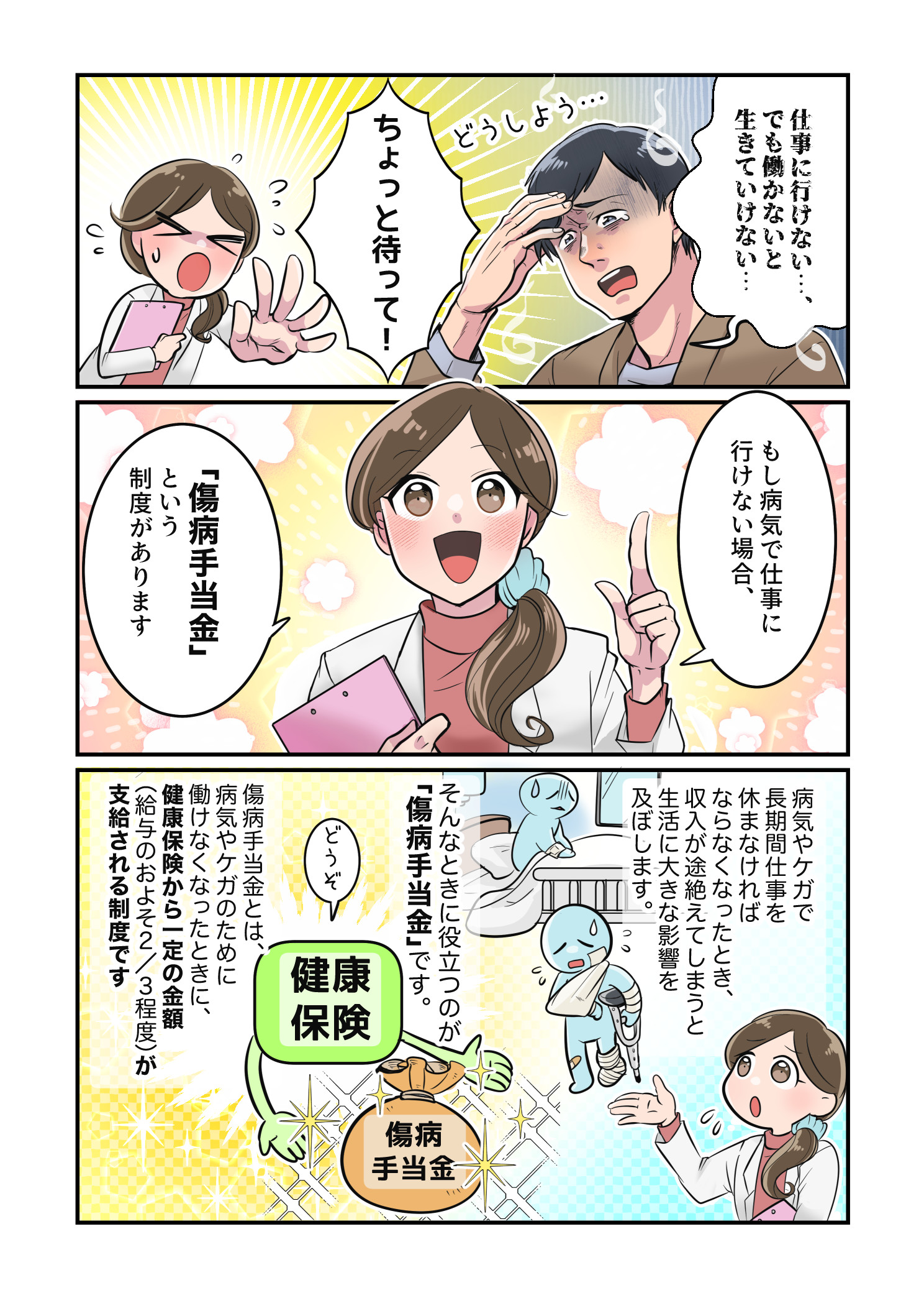 漫画では、働く患者さんが体調不良で休職する場面をきっかけに、医師や事務スタッフのアドバイスを受けながら傷病手当金を申請していく過程を描いています。