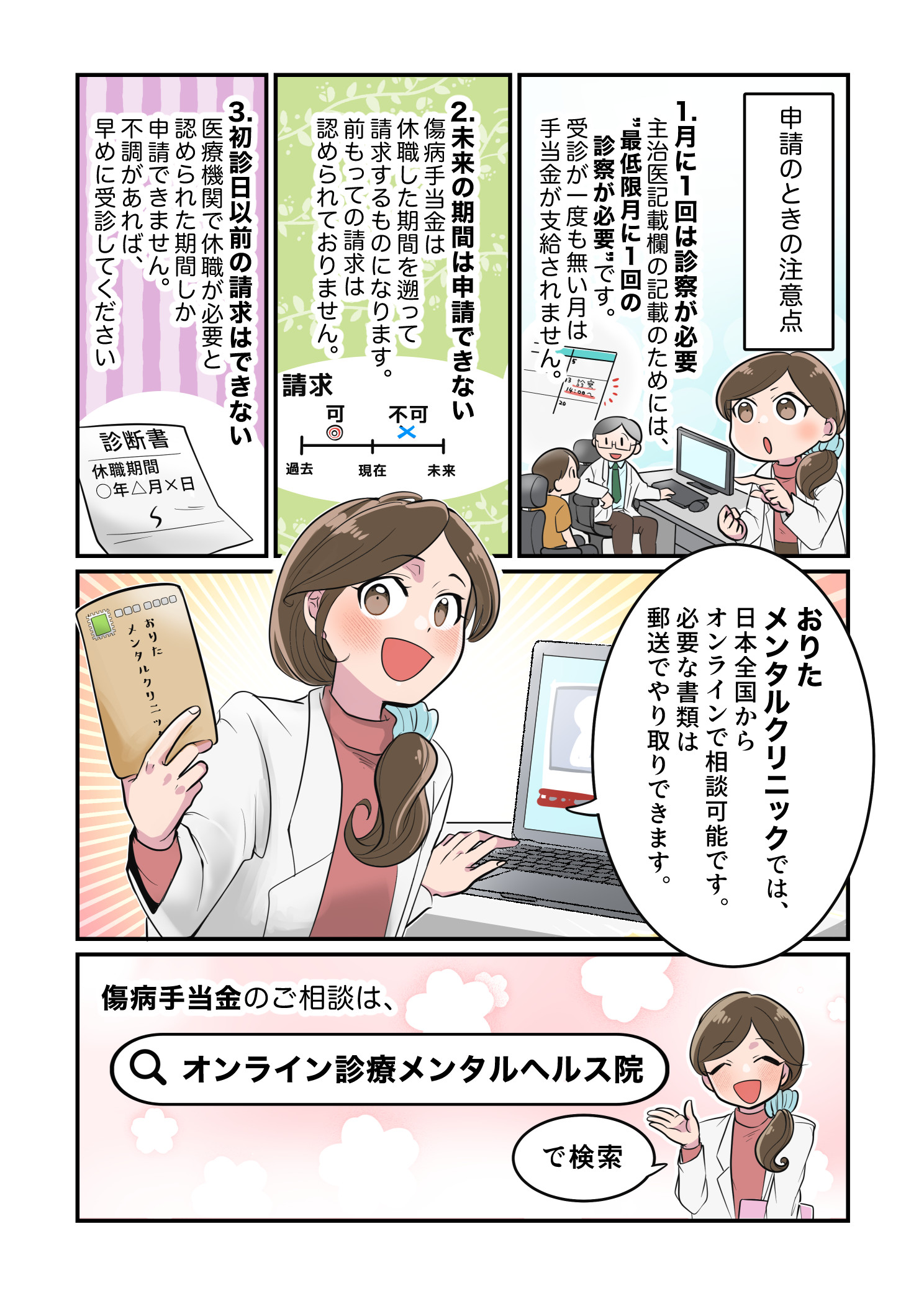 おりたメンタルクリニック(所在地:東京都中央区)は、働く方が安心して療養に専念できるよう、「傷病手当金の申請手続き」をわかりやすく解説したオリジナル漫画を制作・公開しました。