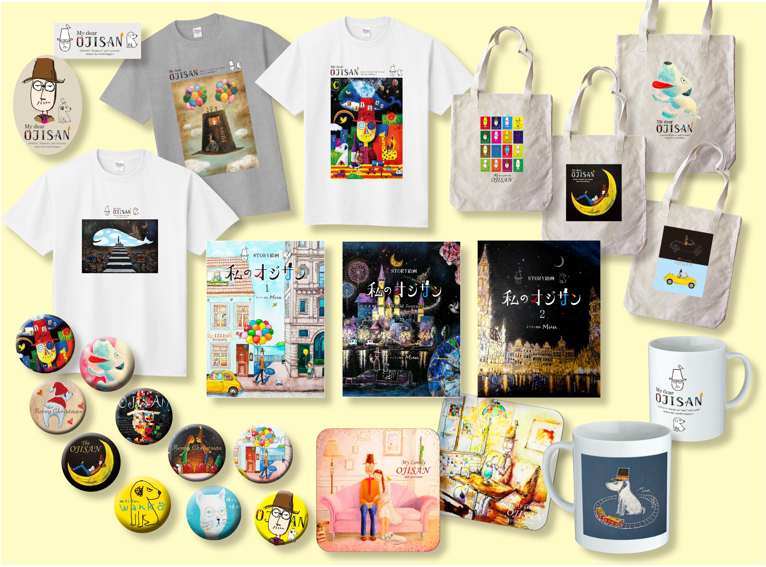 本展示ではオジサン画家MUUによる、わんこと小鳥とともに世界を旅するオジサンの物語を描いた原画が並びます。ベルギーのグランプラス広場、パリの街並み、プラハ城やカレル橋、エジンバラの時計塔など、異国の風景を背景にした幻想的で心温まるシーンが満載です。