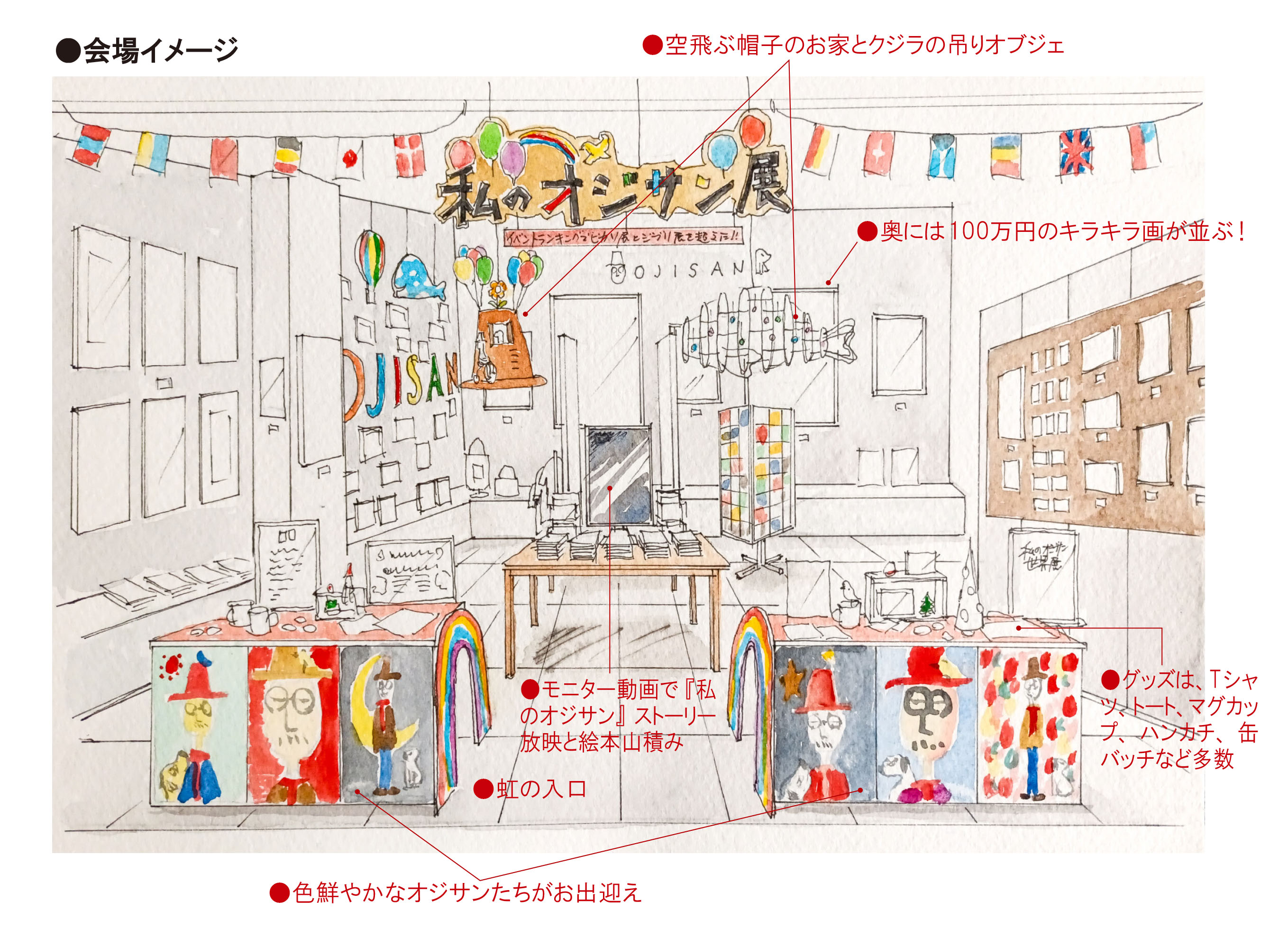 本展示は、絵本『私のオジサン』シリーズ全3巻の世界観を再現しており、絵画だけでなく天井から吊るしたオブジェ、モニターでの動画上映、絵本コーナーなど、鑑賞者が作品世界に没入できる構成になっています。さらに、作家自身による作詞作曲のオリジナルソング『みんなで描こう〜Happy World〜』のパフォーマンスが行われる可能性もあります。