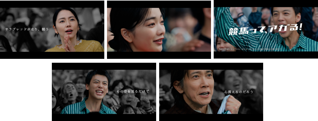 数々の名レースを捉えた迫力の映像と興奮の実況とともに映し出されるのは、競馬場の客席でレースを観戦する長澤まさみさん、見上愛さん、佐々木蔵之介さん、竹内涼真さんの4人の姿。祈るようにレースの行方を見守る長澤さん、うっすら涙を浮かべる見上さん、体に力が入り内側から震えている佐々木さん、雄叫びを上げながら熱狂する竹内さんと四者四様の姿を見せます。