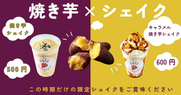 焼き芋 × シェイクカフェグランベリーのラインナップに2種類の焼き芋シェイクが登場。まずは、オーソドックスな焼き芋シェイク。香ばしい焼き芋をそのまま飲んでいるようなシェイク…