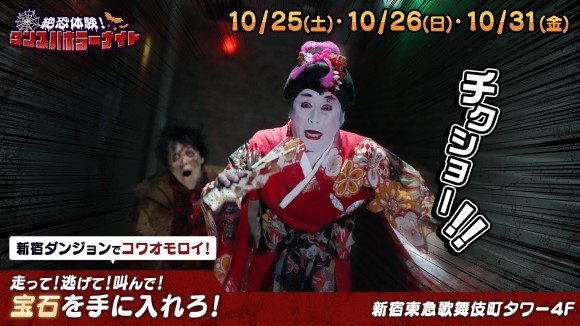 ■コウメ太夫さんによる圧巻のメインビジュアル! ゾンビに追われて全力で逃げるコウメ太夫さん。 まさに今回のテーマである「コワオモロイ!」に、ぴったりのユニークとホラーが融…