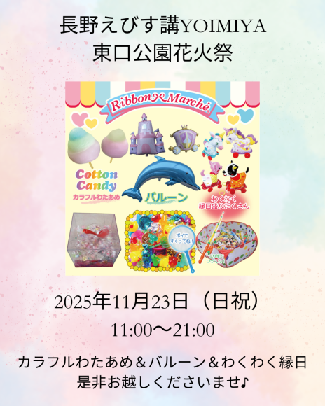 『カンパイ横丁 in 東口公園花火祭』に出店致します♪フード店や子ども向け屋台、クラフトのお店が集結します。当店は【カラフルわたあめ】&【バルーン】&【わくわく縁日】を出店い…
