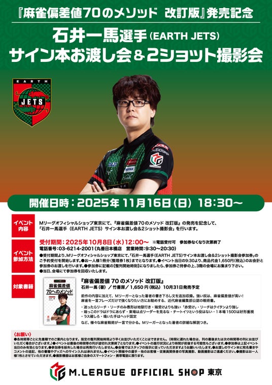 対象書籍を購入時より、MJリーグオフィシャルショップ東京にて、「石井一馬選手(EARTH JETS)サイン本お渡し会&2ショット撮影会」参加券の配布を開始いたします。