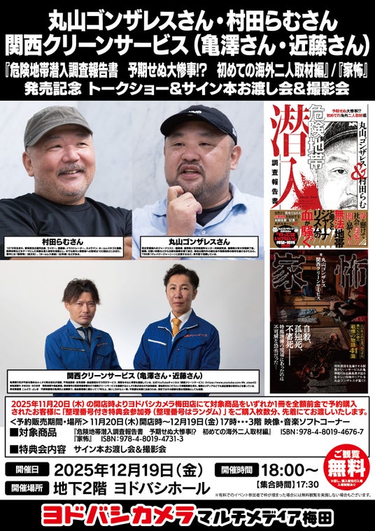 2025年11月20日(木)の開店時よりヨドバシカメラ梅田店にて対象商品をいずれか1冊を全額前金で予約購入されたお客様に「整理番号付き特典会参加券(整理番号はランダム)」をご購入枚数分、先着にてお渡しいたします。<予約販売期間・場所>11月20日(木)開店時~12月19日(金)17時…3階 映像・音楽ソフトコーナー