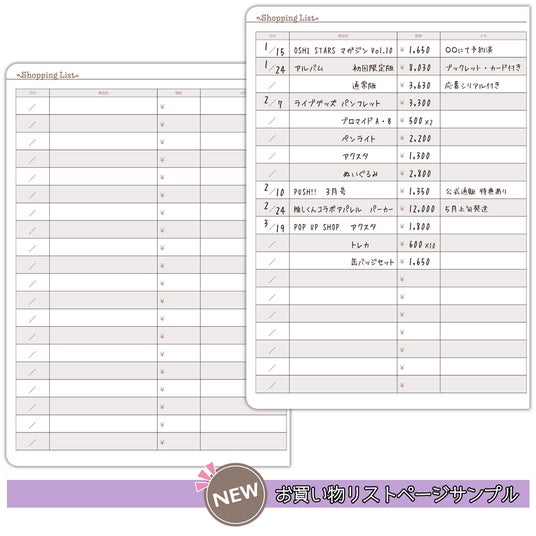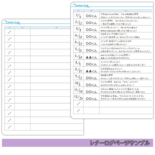 そのほか、月ごとの推し活の振り返りを書き留める「マンスリーログ」や、配信・ラジオの記録を残せる自由記述ページ、ファンレターの内容を記録するページもあり、日々の“推しごと”を多角的に記録・振り返ることができます。