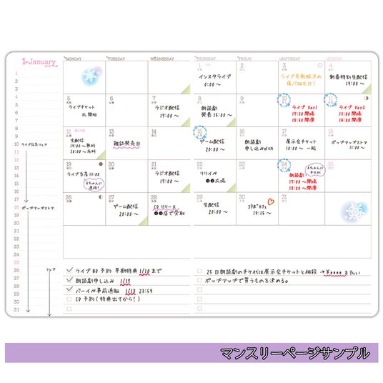 スケジュール管理の中核となるのは、ブロックタイプと縦書きタイプの2種類のマンスリーページ。それぞれの月にはToDoリストも付いており、発売日やイベント準備などのタスクを明確に整理できます。