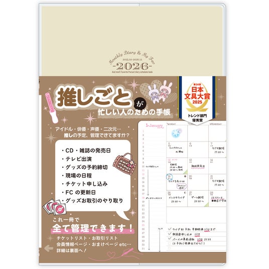 『推しごと手帳』は、ライブやイベントの現場、雑誌やCDの発売日、配信スケジュールやグッズ情報まで、推し活にまつわるすべての予定や記録を一元管理できる手帳です。昨年発売された2025年版は、その機能性とユーザーニーズに応える設計が高く評価され、第34回日本文具大賞〈トレンド部門〉を受賞いたしました。今回登場する最新版では、その魅力をそのままに、さらに使いやすくアップデートされています。