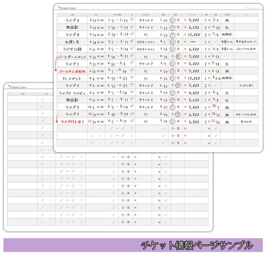 また、チケットの申し込み日や当落、支払期限などを記録できる「チケット情報ページ」、ファンクラブや月額サービスのID・パスワード、会費などをまとめて管理できる「会員情報ページ」など、推し活に必要な情報を網羅的に記録できる構成となっています。