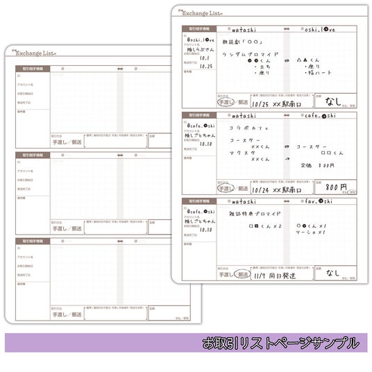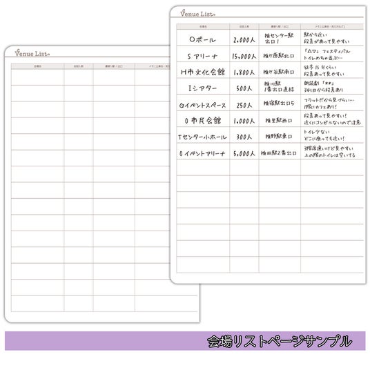 「お取引ページ」では、SNS等を通じたグッズの交換や譲渡などのやりとりを記録でき、発送状況や相手の情報を手元で管理するのに役立ちます。さらに、会場ごとのキャパシティや最寄駅、アクセス方法などをまとめられる「会場リスト」や、新たに追加された「お買い物リスト」ページでは、グッズやCD、雑誌などの発売日・価格などを記録し、予約や購入の管理に活用できます。