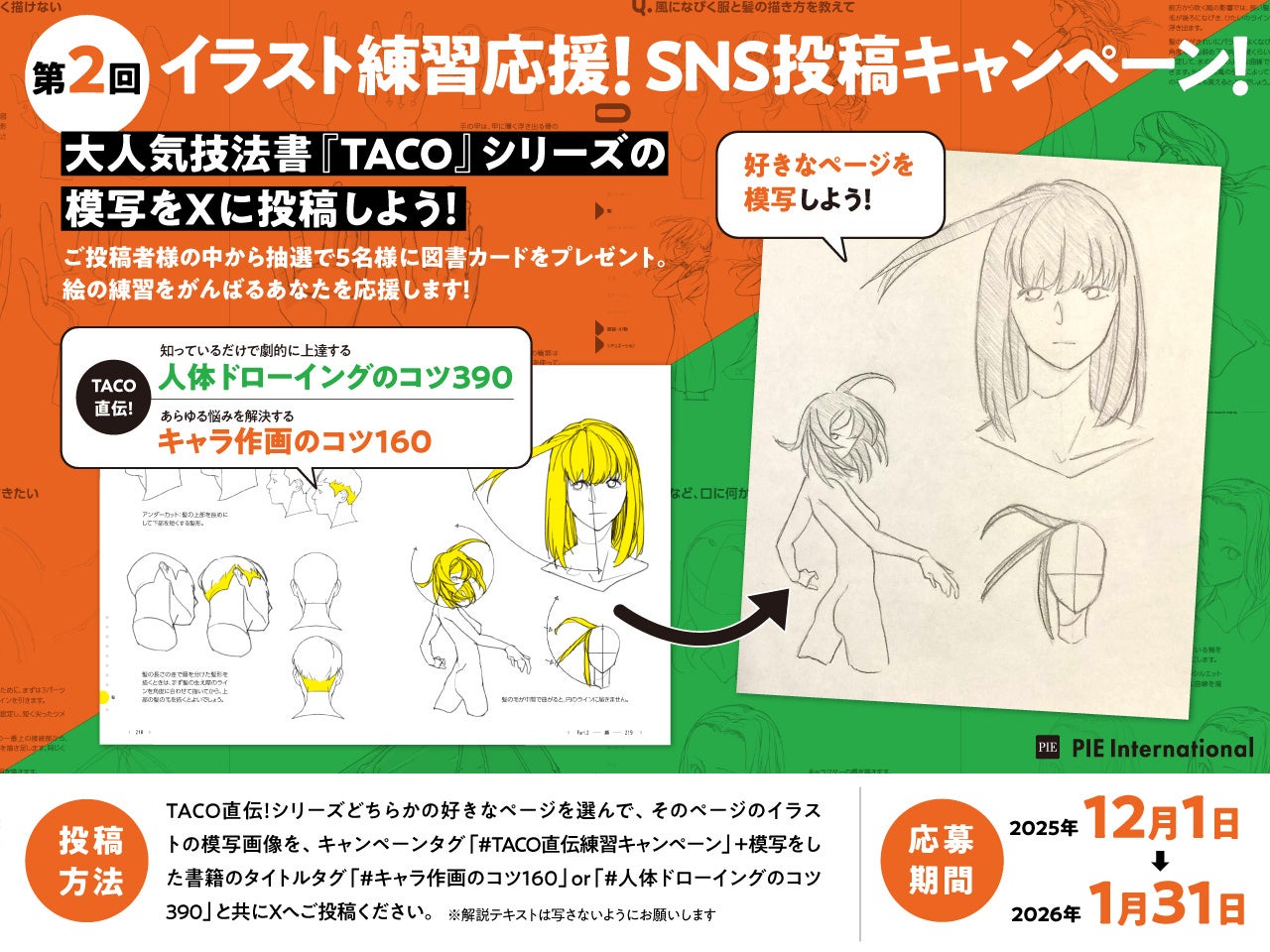 2.『TACO直伝!』シリーズどちらかの好きなページを模写した画像を、「#TACO直伝練習キャンペーン」+選んだ書籍のタイトル「#キャラ作画のコツ160」or「#人体ドローイングのコツ390」をつけてXに投稿