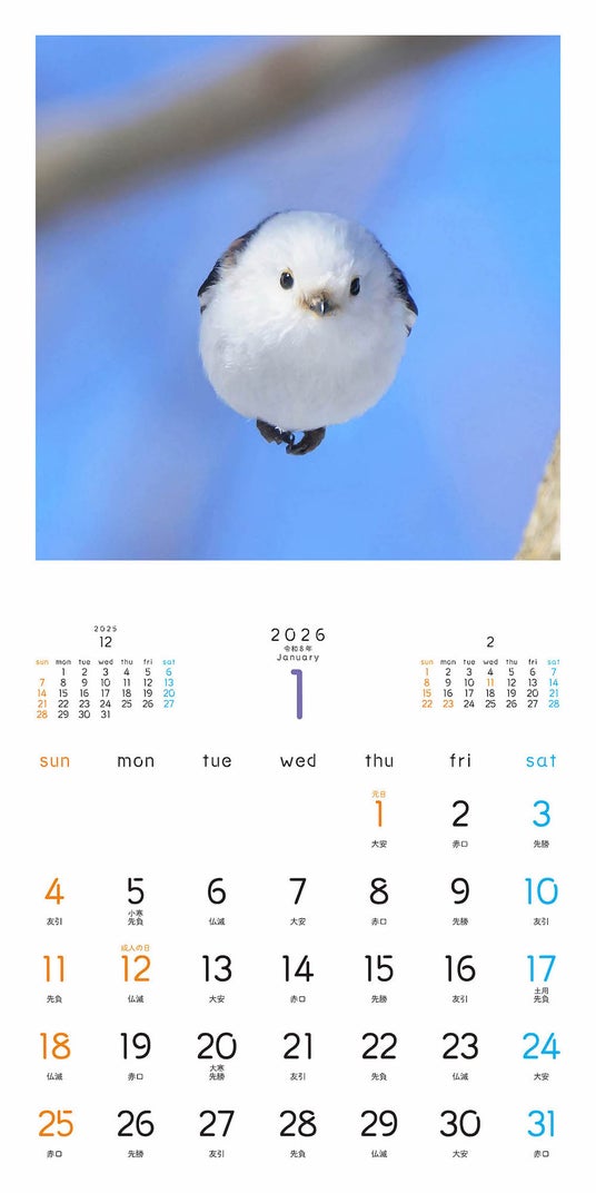 雪の妖精・シマエナガが一年間楽しめる、2026年カレンダー!北海道在住のカメラマン・吉永勝啓さんが、新たに撮りおろしたシマエナガの「もふもふふわふわ」な厳選ベストショットを一年中たのしめます。