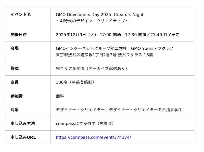 GMOインターネットグループ株式会社(本社:東京都渋谷区、代表取締役グループ代表:熊谷 正寿)は、2025年12月9日(火)に、「GMO Developers Day 2025 -Creators Night‐」を開催いたします。今回は、初めてデザイナー・クリエイターを対象に”AI時代のデザイン・クリエイティブ”をテーマに開催し、AIの進化によって変化する“つくる”という行為の本質と、これからの創造のあり方を探ります。