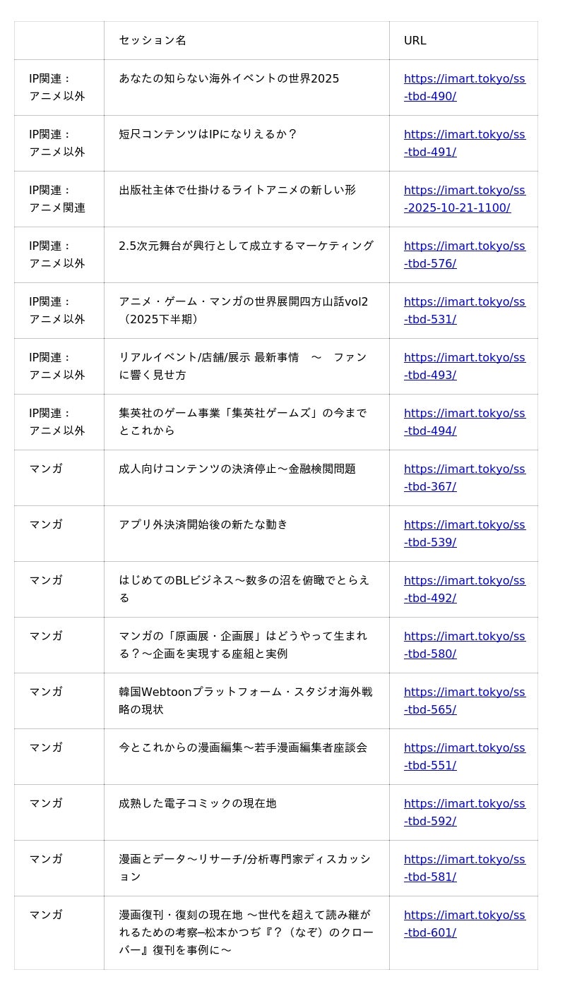 一般社団法人MANGA総合研究所(代表理事:菊池健)が2025年11月12日(水)に開催する第6回となるマンガ・IPのボーダーレス・カンファレンス「IMART2025(国際MANGA会議 Reiwa Toshima)」の配信セッションを追加で公開いたしました。全20セッション、Liveセッションと配信セッションのハイブリッドで業界の最新事例をお届けいたします。
