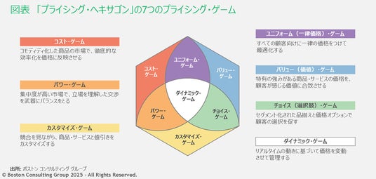 本書は日本企業のプライシング能力向上の一助になればという思いから、世界の経営リーダーの注目を集めてきた原書[注1]を翻訳・再編集したものです。多様で複雑なプライシングの戦略的な枠組み・手法を統合的に整理する「プライシング・ヘキサゴン」という考え方で7つのプライシング・ゲーム(図表)を定義し、それぞれの特性と戦い方を解説します。BCGの豊富なクライアント支援経験と研究を基に、B2B、B2Cを含む幅広い業界の事例をまじえ、理論と実践の両面から考察しています。