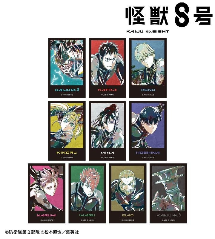 怪獣8号、日比野カフカ、市川レノ、四ノ宮キコル、亜白ミナ、保科宗四郎、鳴海弦、古橋伊春、四ノ宮功、怪獣9号のイラストを新たなタッチで魅力的に表現し、アクリルカードに仕上げました。