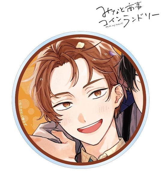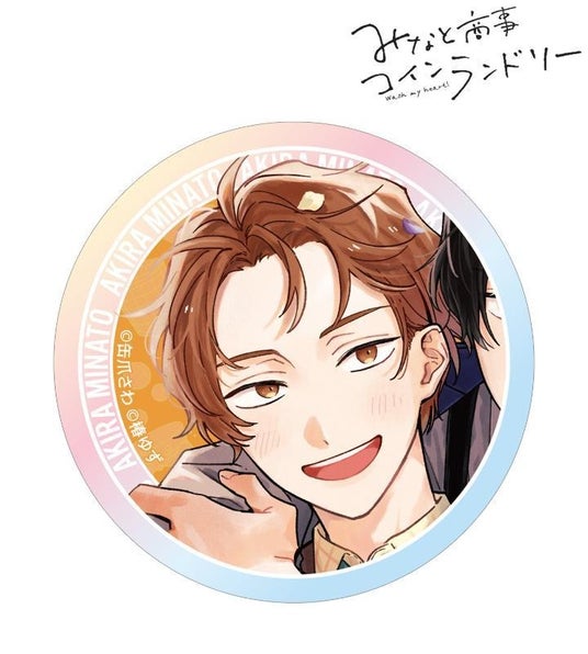 湊 晃、香月 慎太郎のカラーイラスト、ランドリー店をイメージしたモチーフをホログラム加工を施した缶バッジ3個セットに仕上げました。