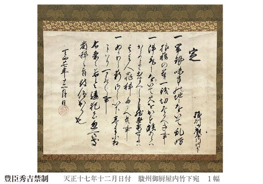 「豊臣秀吉禁制(とよとみひでよしきんぜい)」は、秀吉が天正17年12月に駿河国御厨竹下村に発給した文書で、小田原北条氏討伐に進む軍勢が、その地域にて狼藉などを行うことを固く禁じています。