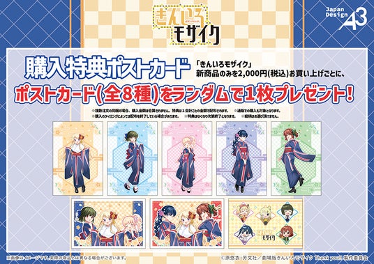 期間中に会場内にて『きんいろモザイク』新商品のみを2,000円(税込)お買い上げごとに、特典ポストカード(全8種)をランダムで1枚プレゼント!