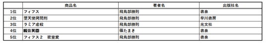 両ランキングを飛鳥部勝則さんが制し、<文芸・文庫>リスト全体の70%をも占める異様さとなった。