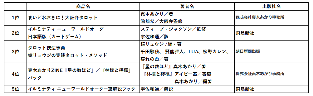 1位は書泉限定販売の商品になります『まいどおおきに!大阪弁タロット』が堂々のランクイン!質問してパッとページを開くとユーモアな“大阪弁”のメッセージをもらえるだけでなく、またタロットや大阪弁の一部を学べる大人気の占い本です。