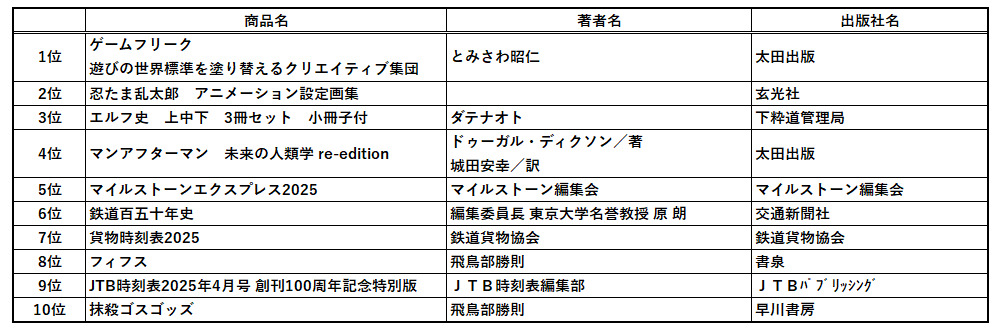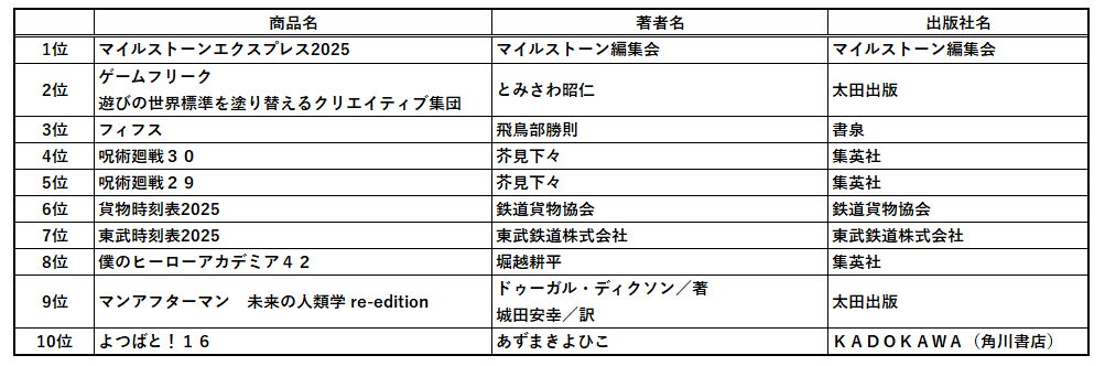 都内に「書泉」「芳林堂書店」を展開する株式会社書泉が、2025年のベストセラーを独自に集計しましたのでお知らせします。(※集計期間は2024年12月1日~2025年11月30日)各社からさまざまなベストセラーランキングが既に発表されていますが、「趣味の本屋」「アタマオカシイ本屋」として独自路線をいく弊社のランキングは今年も、独特なラインナップとなりました。
