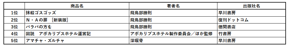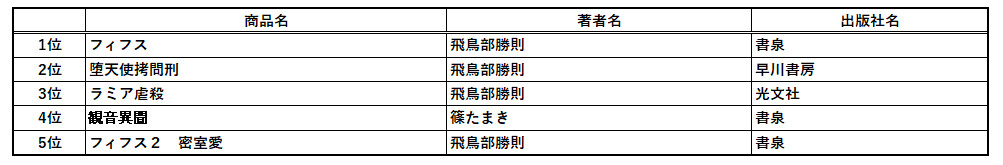 両ランキングを飛鳥部勝則さんが制し、<文芸・文庫>リスト全体の70%をも占める異様さとなった。
