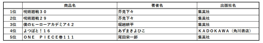 「呪術廻戦」や「僕のヒーローアカデミア」など人気作の完結巻や4年ぶりの新刊「よつばと」など、世間でも大いに盛り上がった作品が書泉でも数字を伸ばしました。