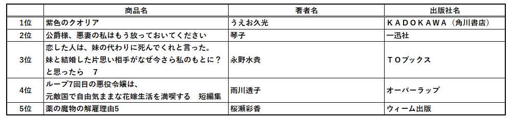 ラノベ・新文芸1位『紫色のクオリア』は芳林堂書店と、10冊の限定復刊作品。大好評で早期に完売しました。2位『公爵様、悪妻の私はもう放っておいてください』はコミカライズが好評で原作書籍化の際は書き下ろしRシーンが大増量され大人気となりました。