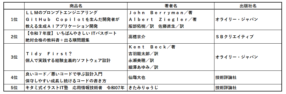 1位は話題の人工知能関連。『LLMのプロンプトエンジニアリング』のほかにも多くの人工知能関連の書籍が出版されました。LLMは「大規模言語モデル(Large Language Models)」の略です。『改訂新版 良いコード/悪いコードで学ぶ設計入門』は著者の仙塲大也さんの選書フェアも好評でした。『Tidy First?』もコード改善とソフトウェア設計に関する書籍です。多くの方が受験される情報処理技術者試験の対策書籍も2位と5位にランクインしました。