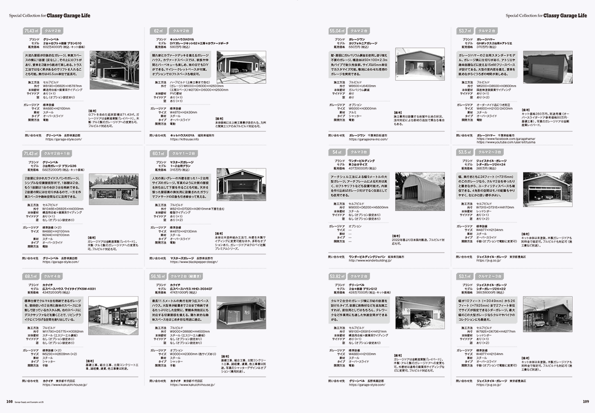 巻末には憧れのガレージライフを楽しむための、100以上のアイテムを収録した「ガレージ・サプライ」や、国内で入手可能なキットガレージを90スタイルも収録した「最新ガレージカタログ」も掲載しました。