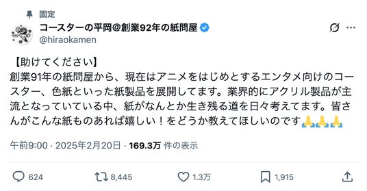 昭和8年創業、東京都台東区上野に本社を構える紙の製造卸問屋、株式会社平岡(代表取締役:平岡 直樹)は、X(旧Twitter)での「バズ」をきっかけに、創業以来92年の歴史で初めてSNSの声を商品化。アクリルスタンドの紙製版、「紙製アクスタ」(愛称:紙スタ)を、紙の日である2025年12月16日よりOEM生産の受注受付を開始いたします。