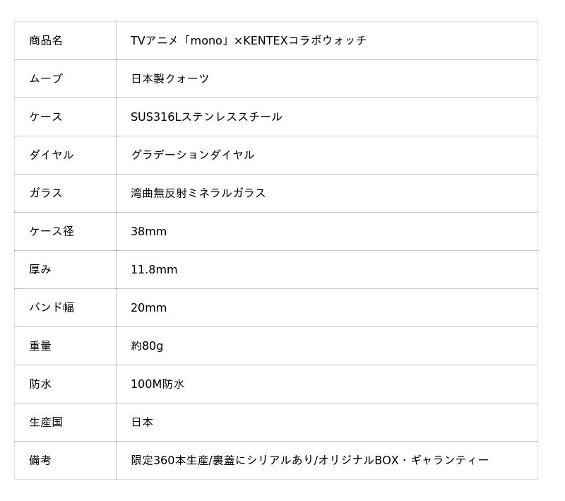 TVアニメ「mono」×国産時計ブランドKENTEXコラボレーションウォッチ予約開始のお知らせ